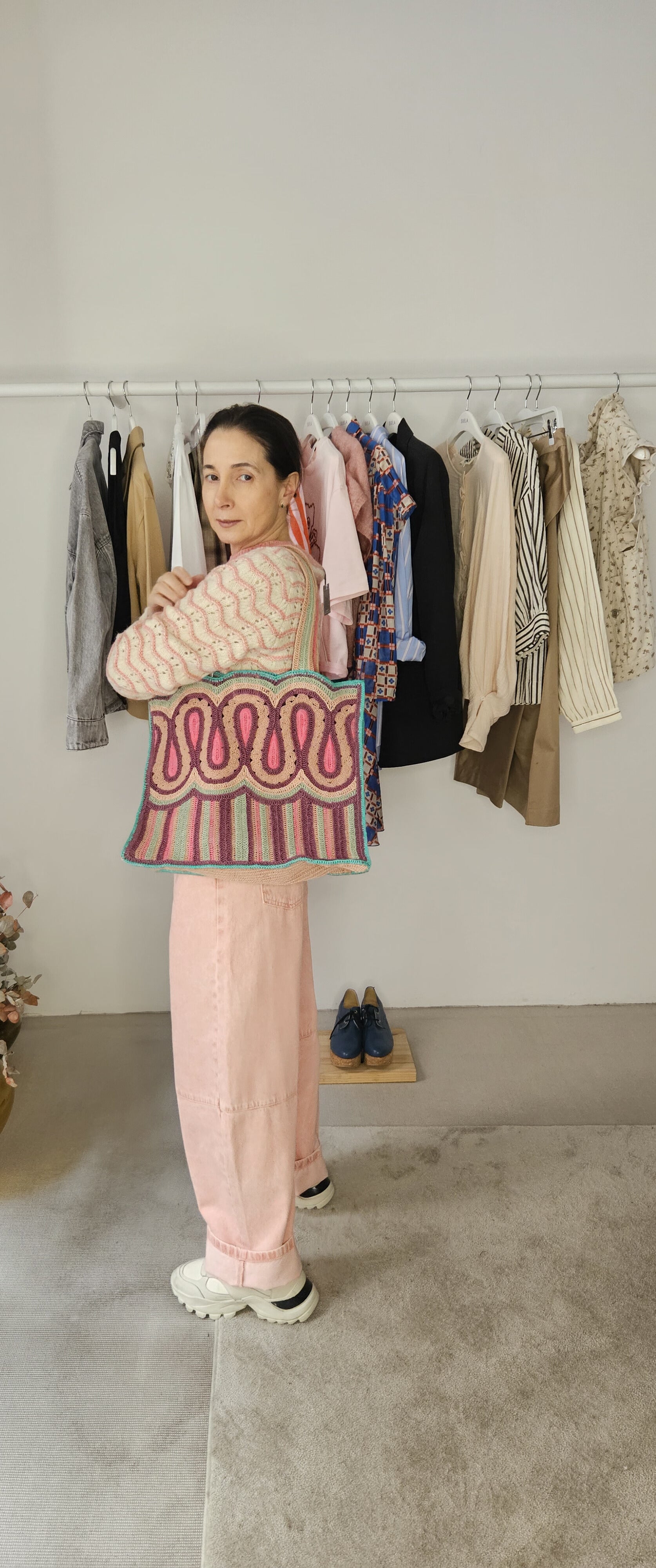 Bolso en mezcla de colores rosas, burdeos, melocotón y verdes.