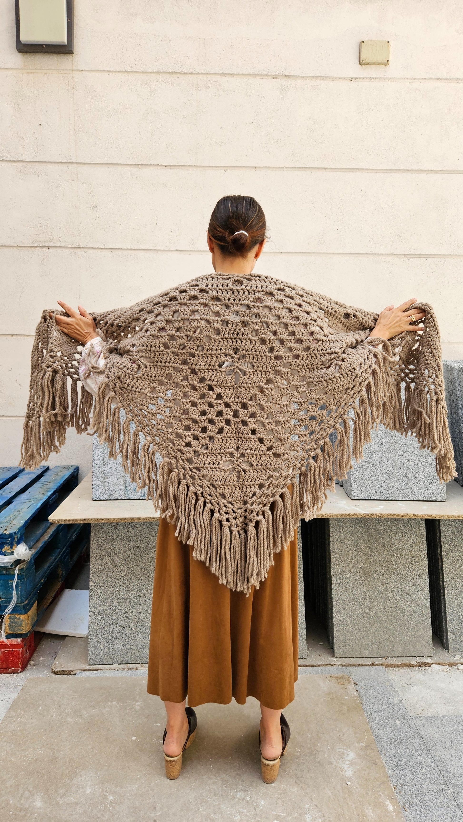 Chal de 55% lana merino y 45% acrílico.