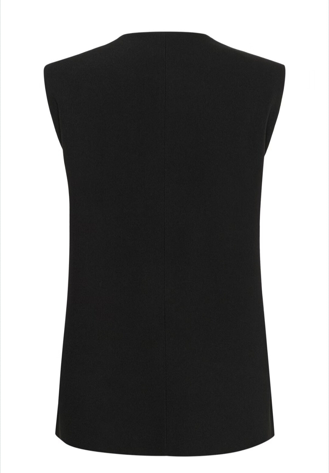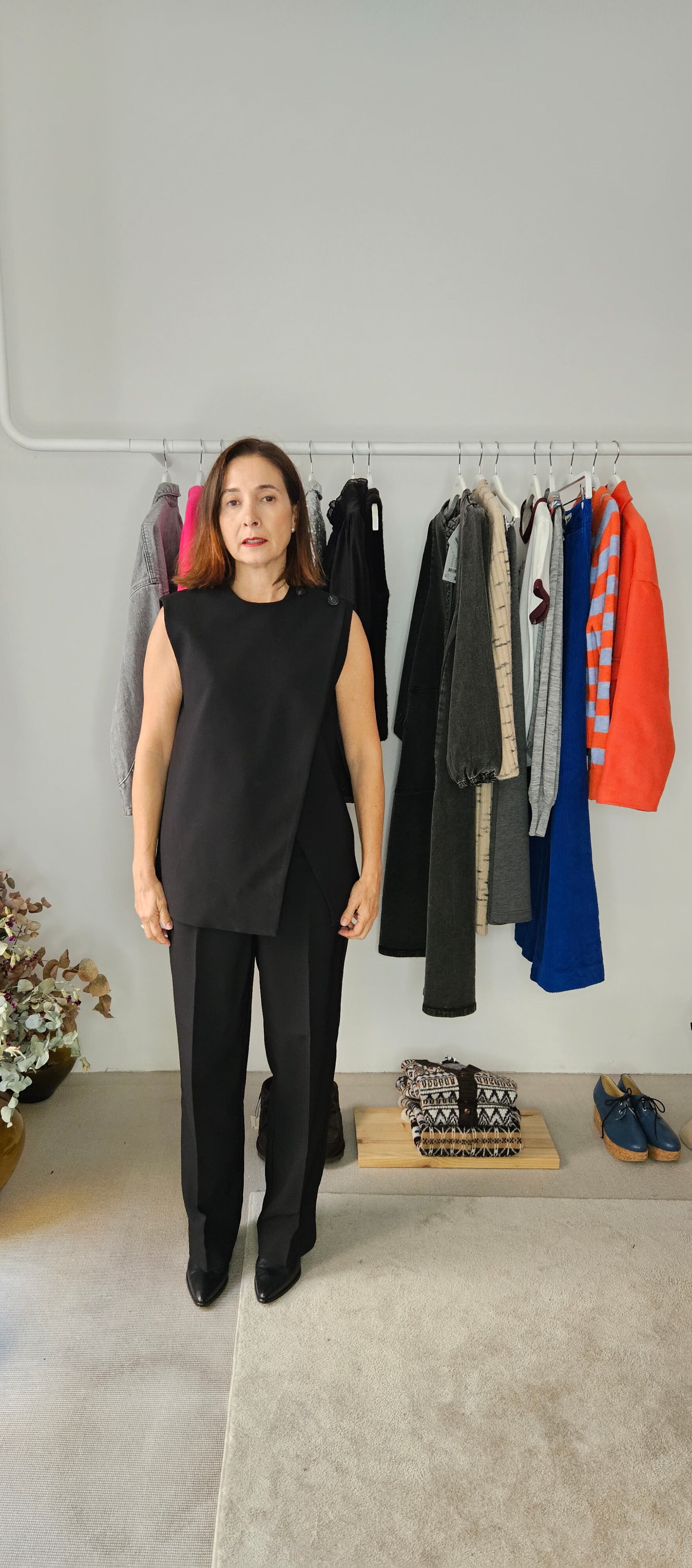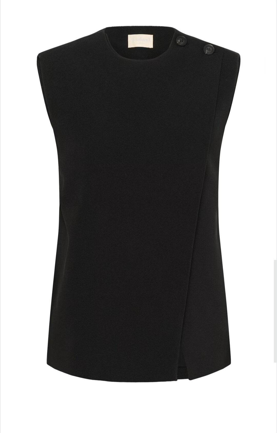 Chaleco cruzado asimétrico con detalle de botón en el hombro.