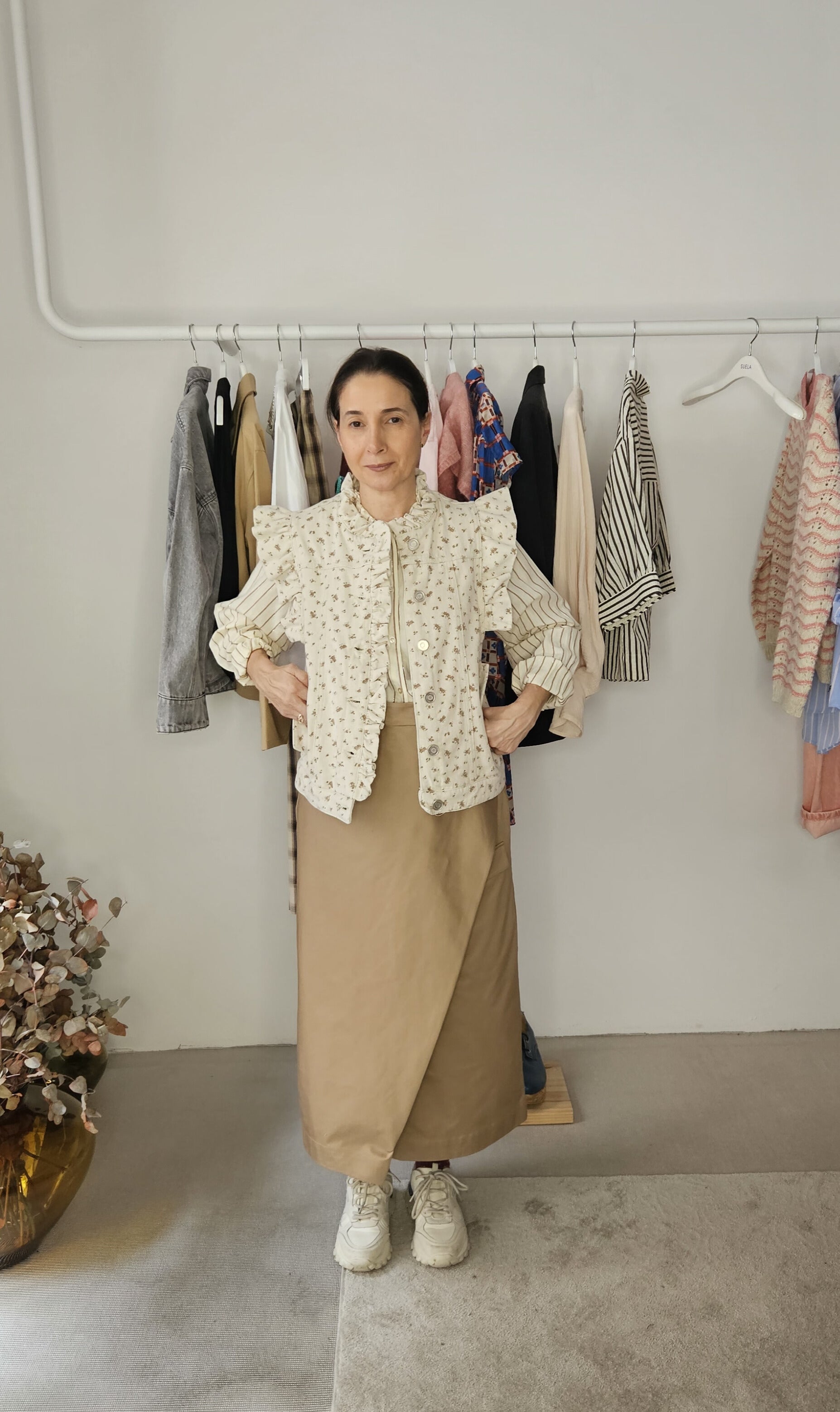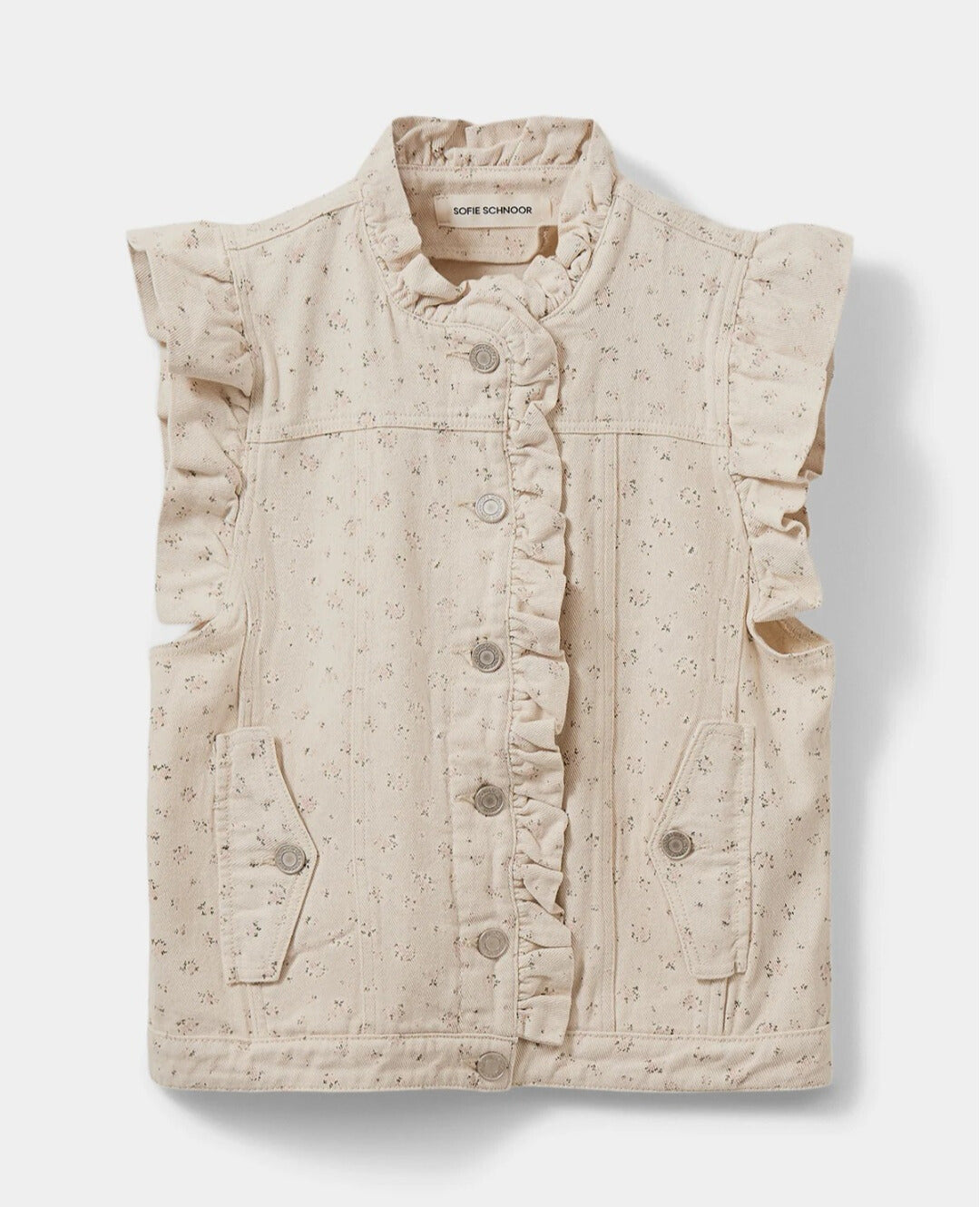 Chaleco denim estampado en flores con detalle de volantes en mangas y delantera.