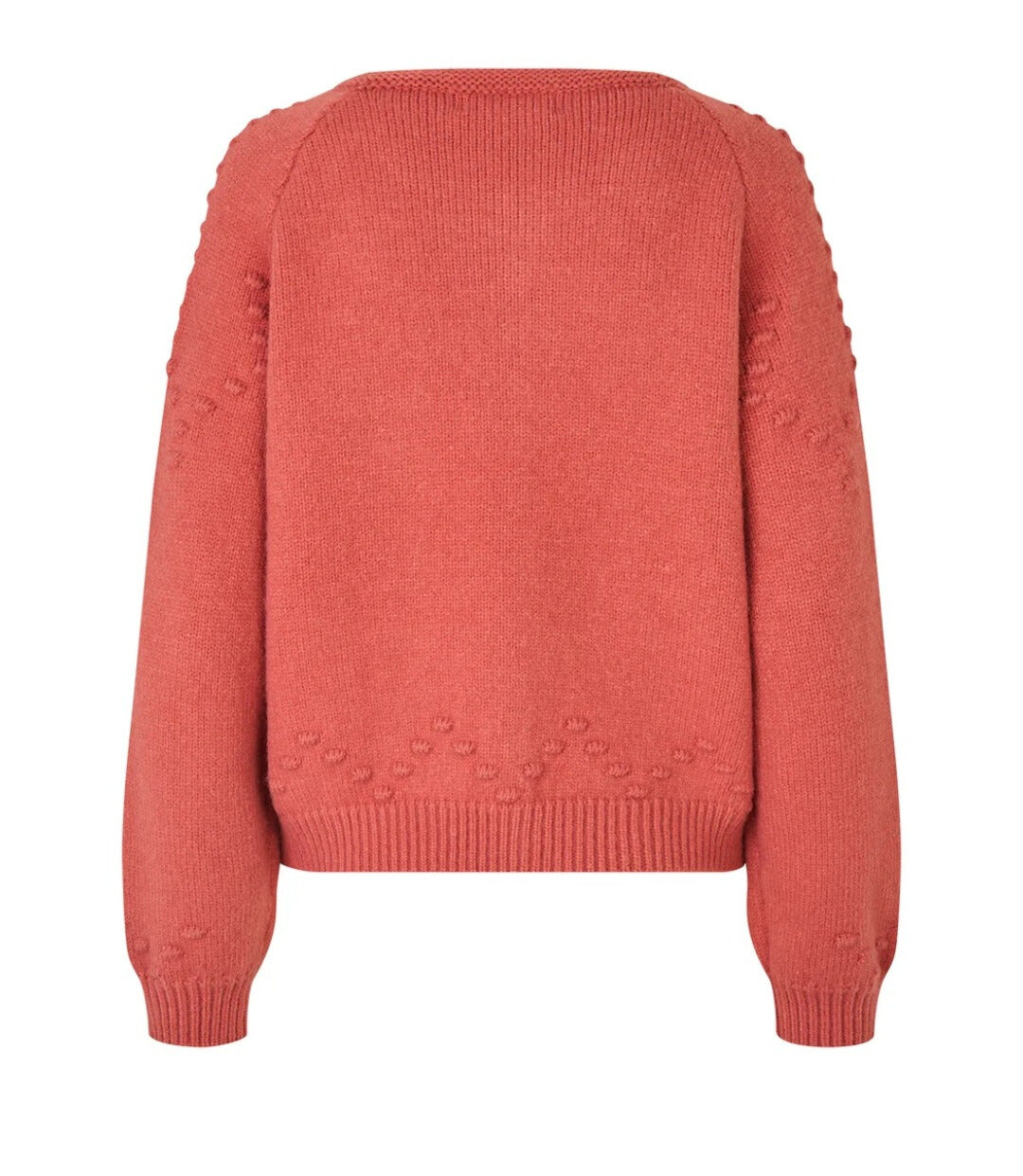 Chaqueta de punto rosa con flores bordadas y botones joya.