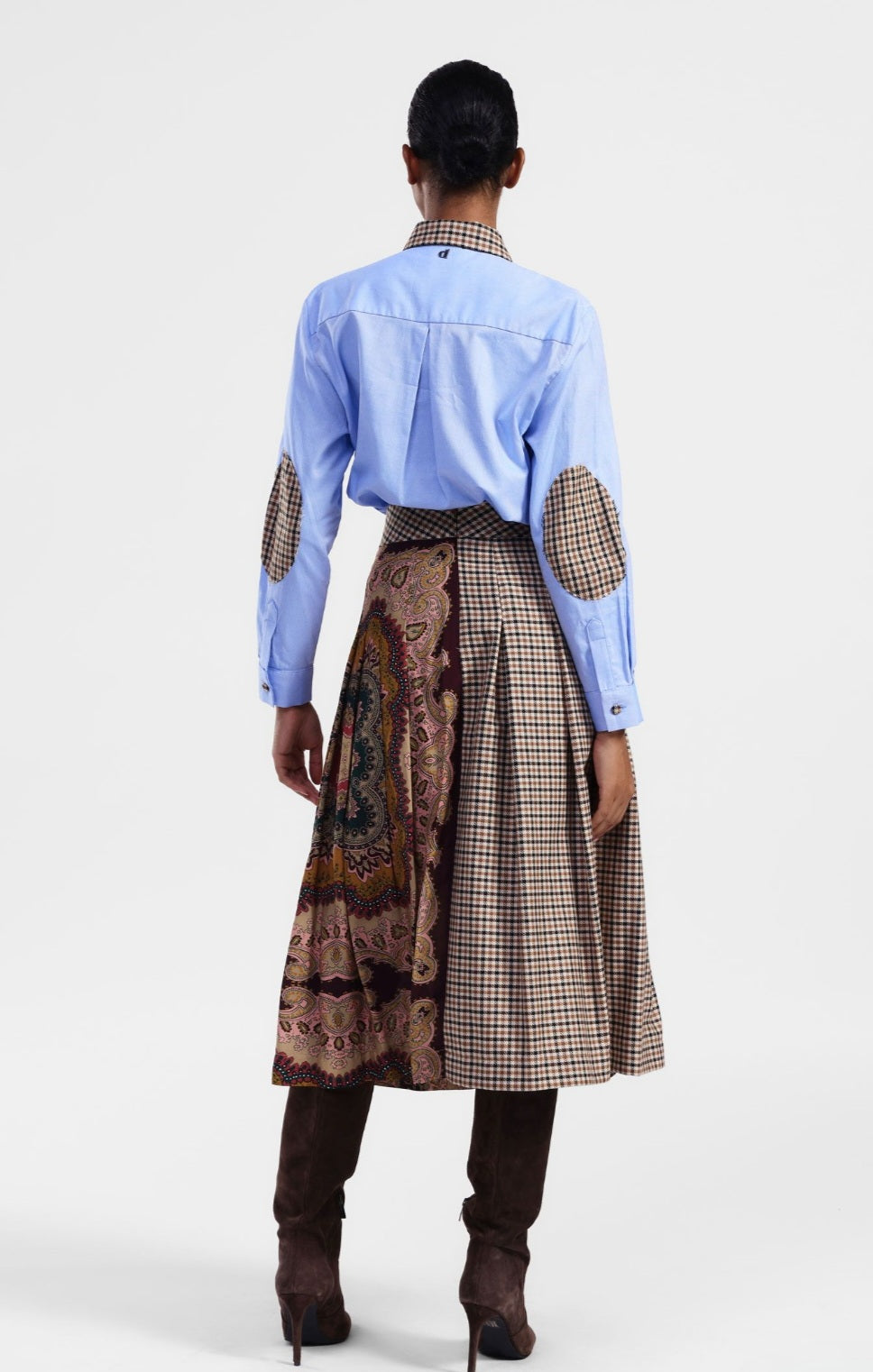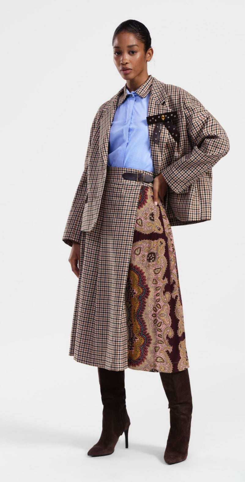 Falda de tablas en tejido combinado de pata de gallo y amebas.