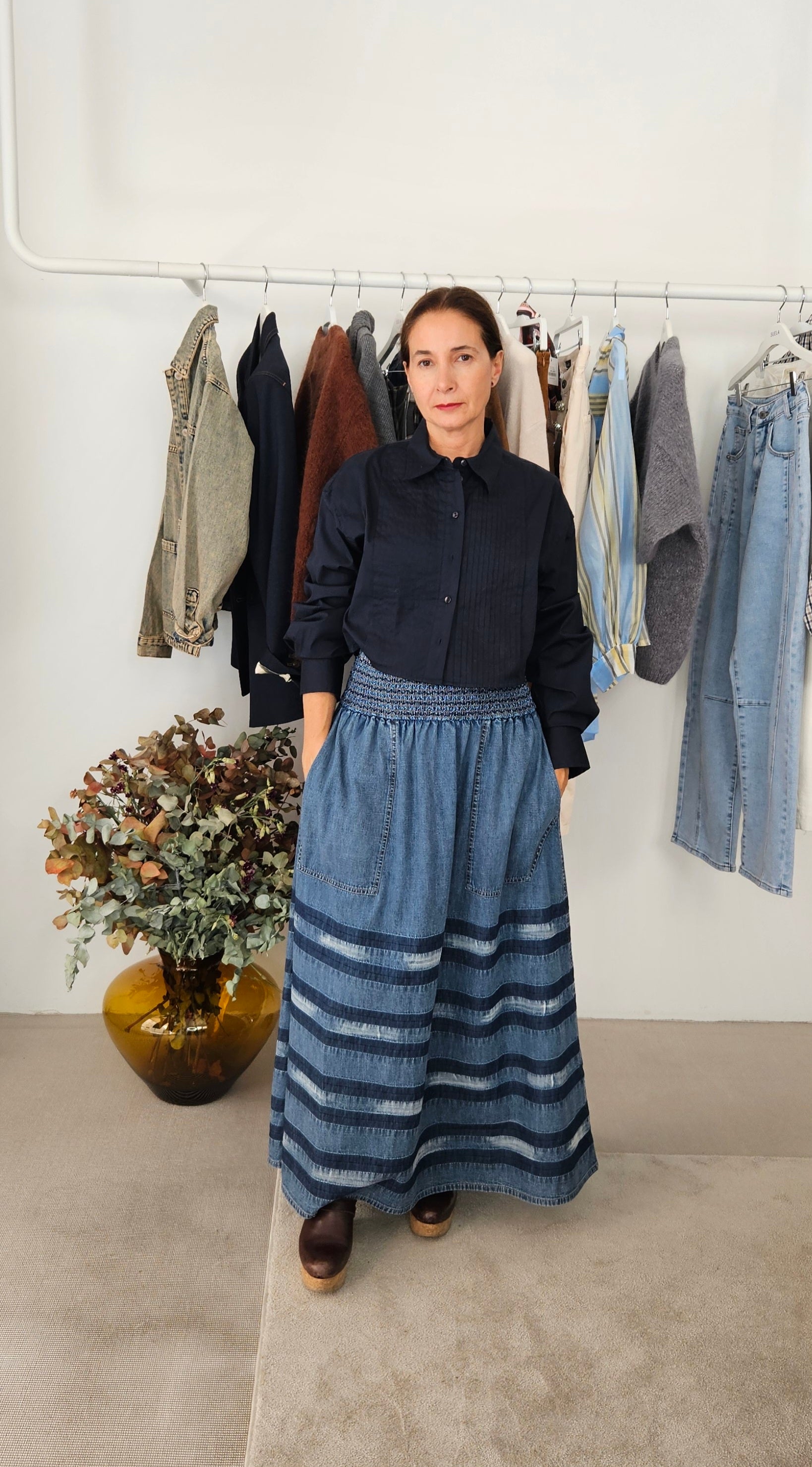 Falda larga vaquera con estampado de rayas y nido de abeja en cintura.