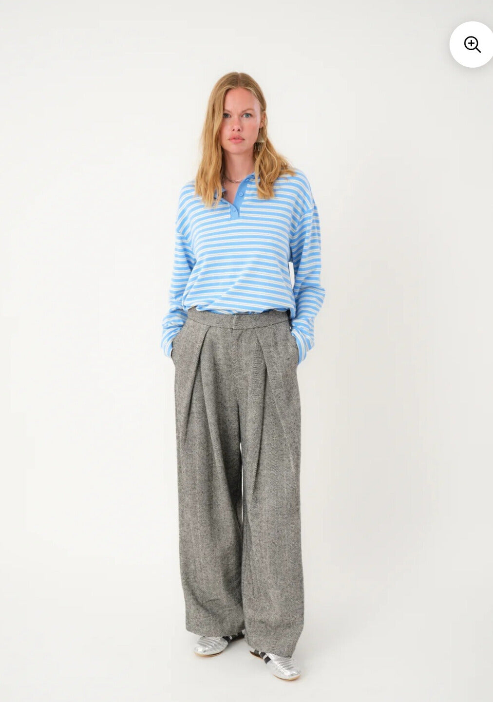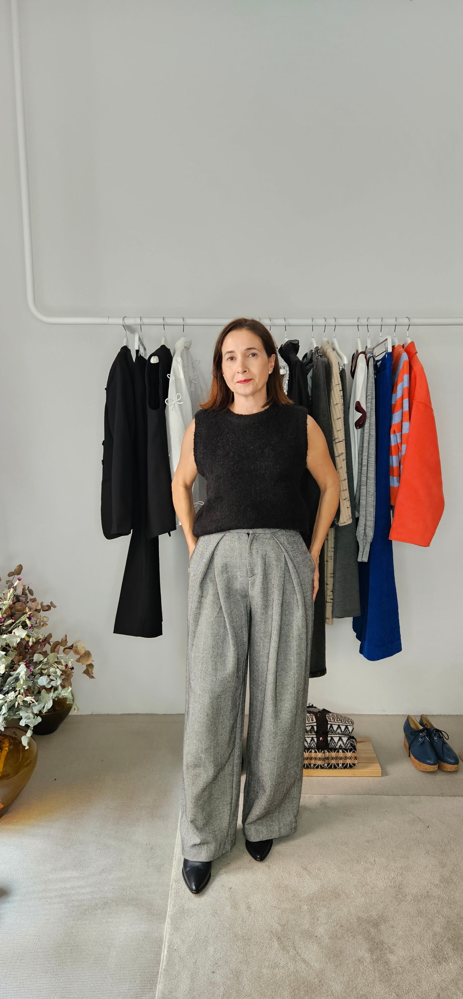 Pantalón con pliegues estampado en espiga blanca y negra.