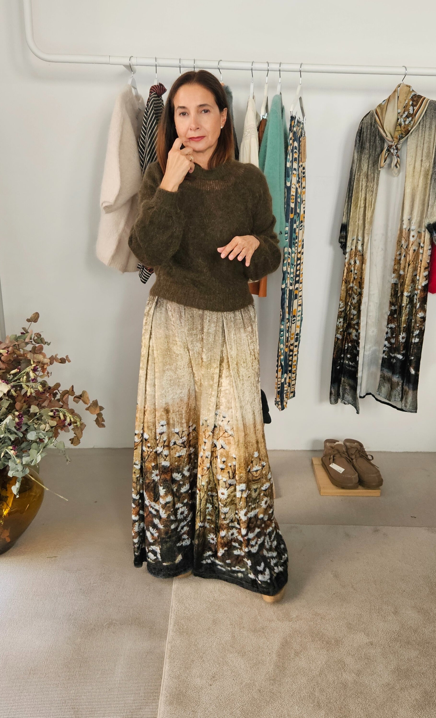 Pantalón de terciopelo con estampado de flores.