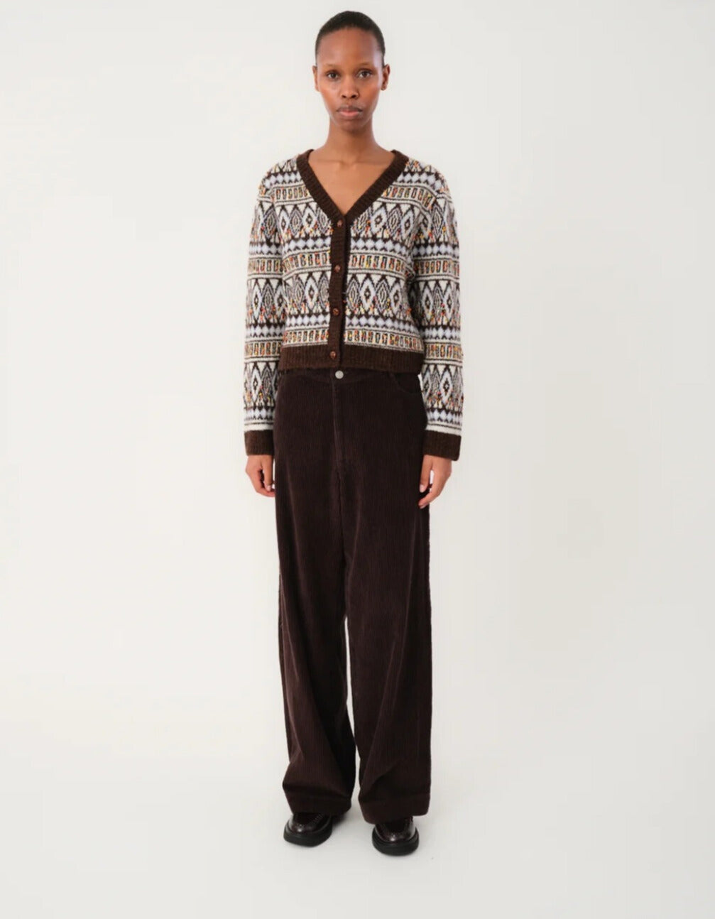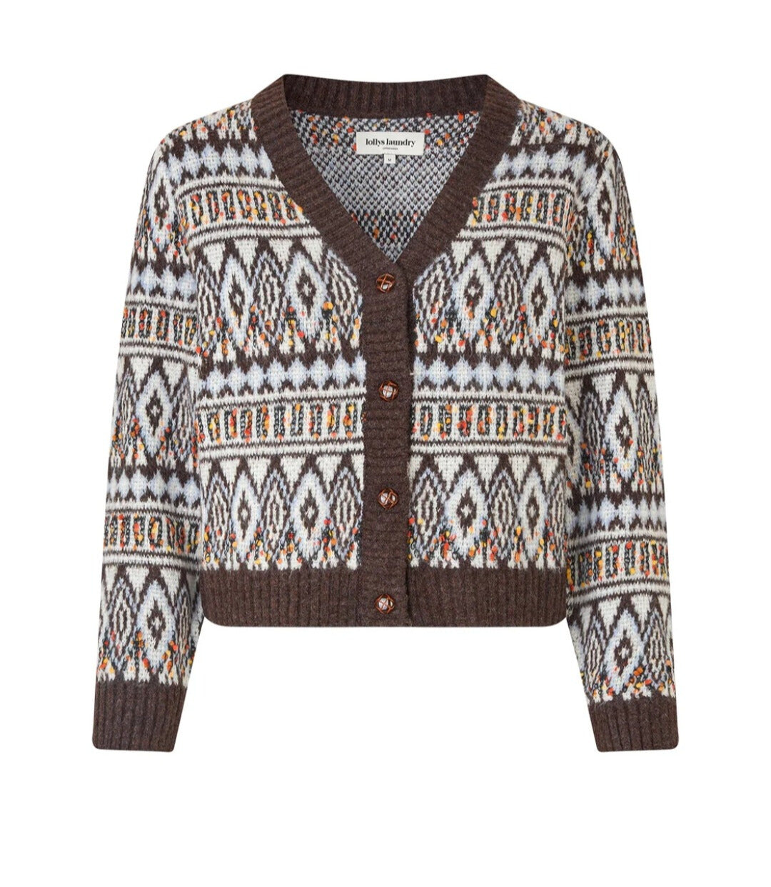 Rebeca de grecas en tonos marrones, crudos y toques de naranja y amarillo.
