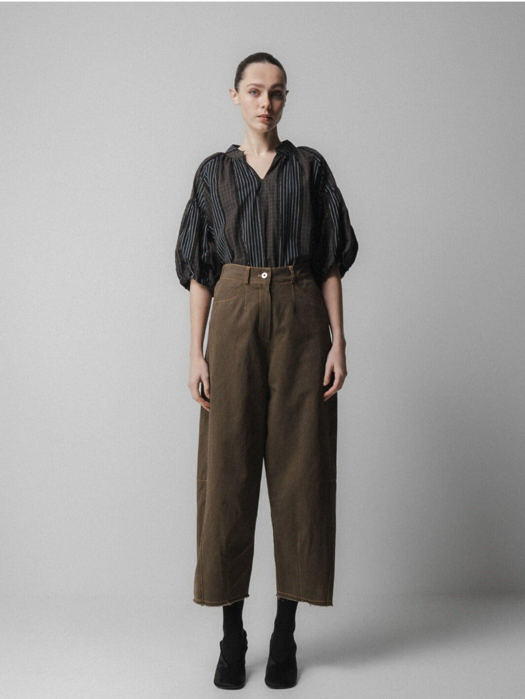 Vaqueros tipo barrel en color kaki con pespuntes a contraste.